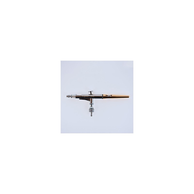 Dispositivo neumático que genera un fino rocío de pintura. Posee una pistola de doble acción, contenedor integrado de 0.75cc, aguja de 0.18mm y adaptador para manguera de PVC. Ideal para pintar uñas.